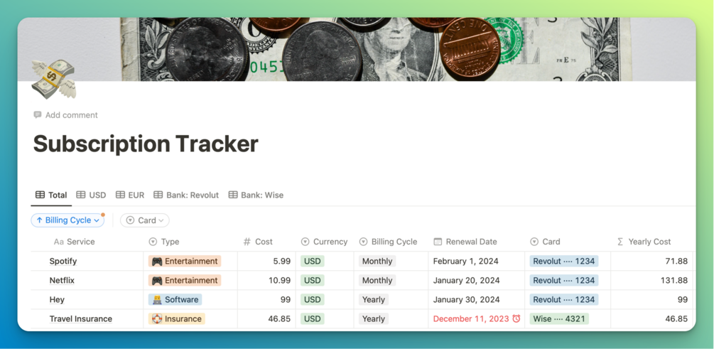 A simple subscription tracker that runs on Notion.